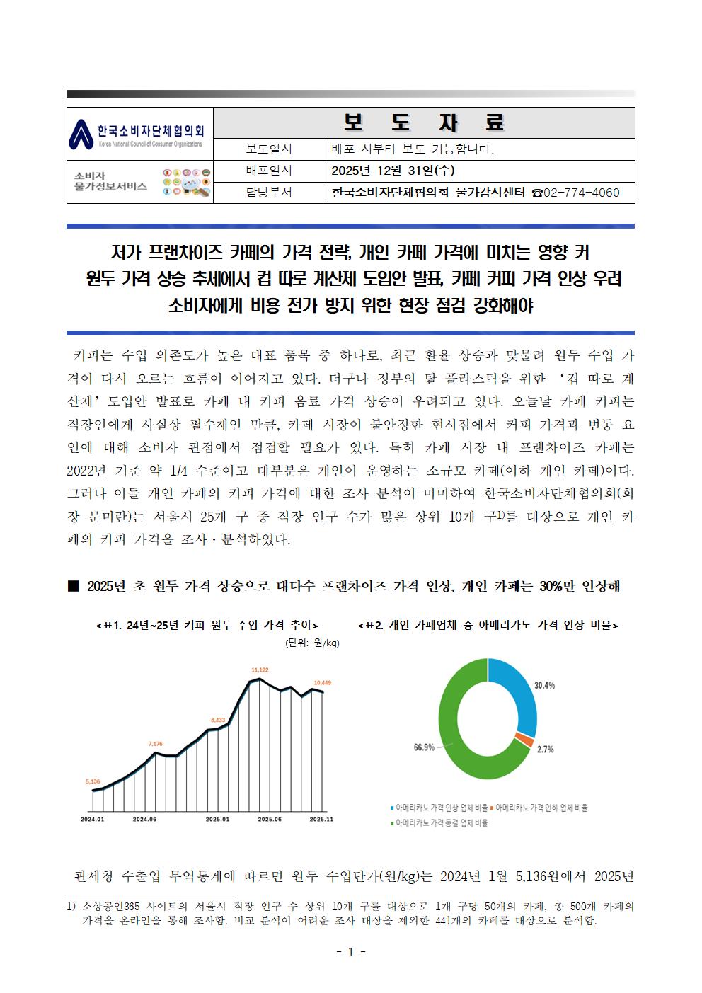 [물가감시] 개인 카페 커피 가격 분석 보도자료