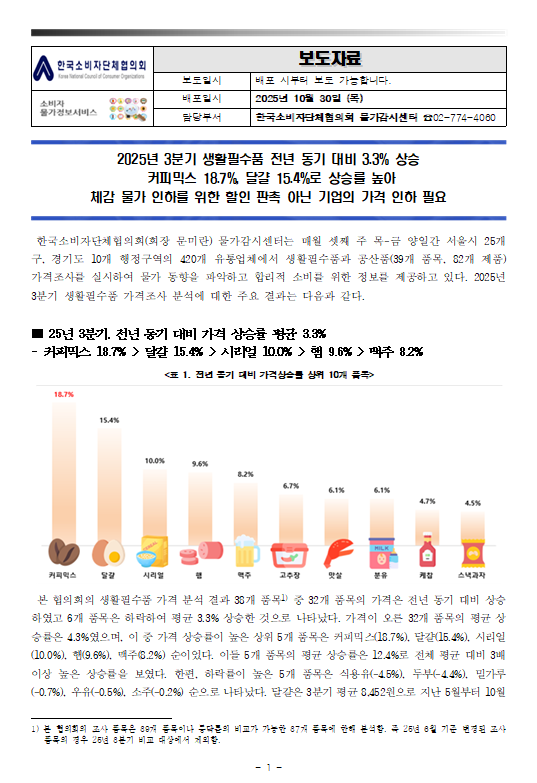 [물가감시] 2025년 3분기 생활필수품 가격조사 결과 보도자료