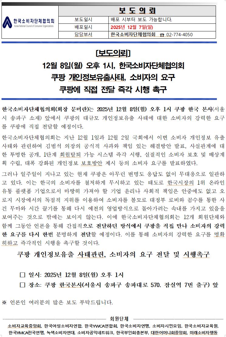 [이슈&운동]쿠팡 개인정보 유출 소비자대책 촉구 기자회견문
