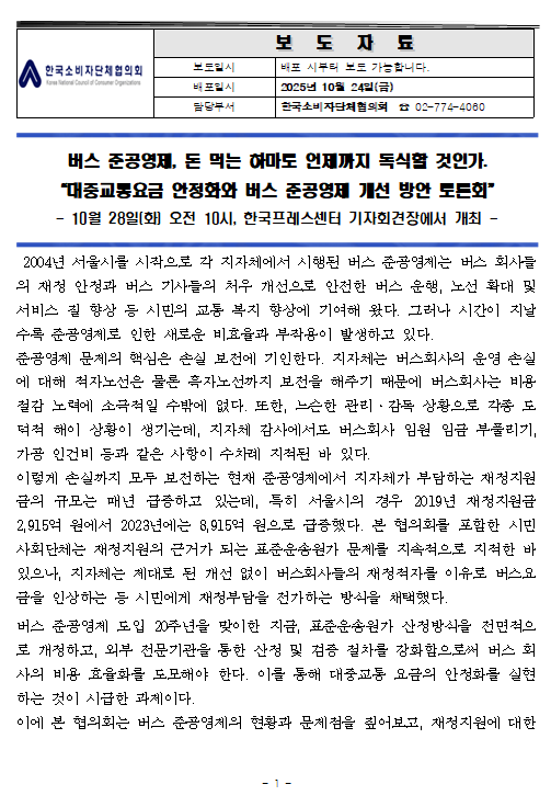 [물가감시] 대중교통요금 안정화와 버스 준공영제 개선 방안 토론회 개최 보도자료...