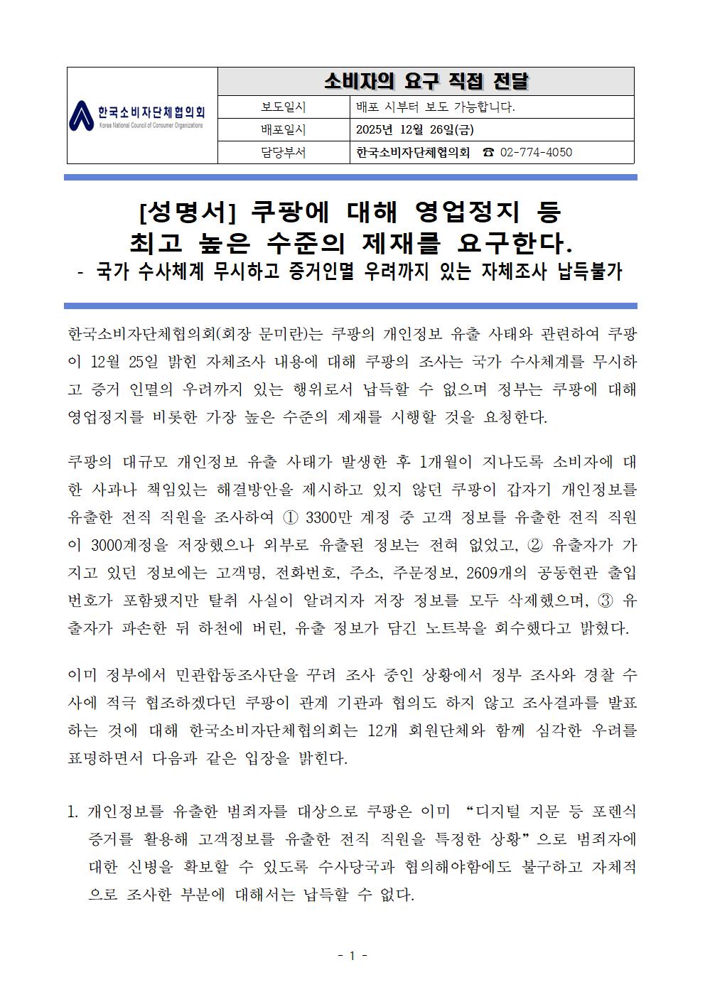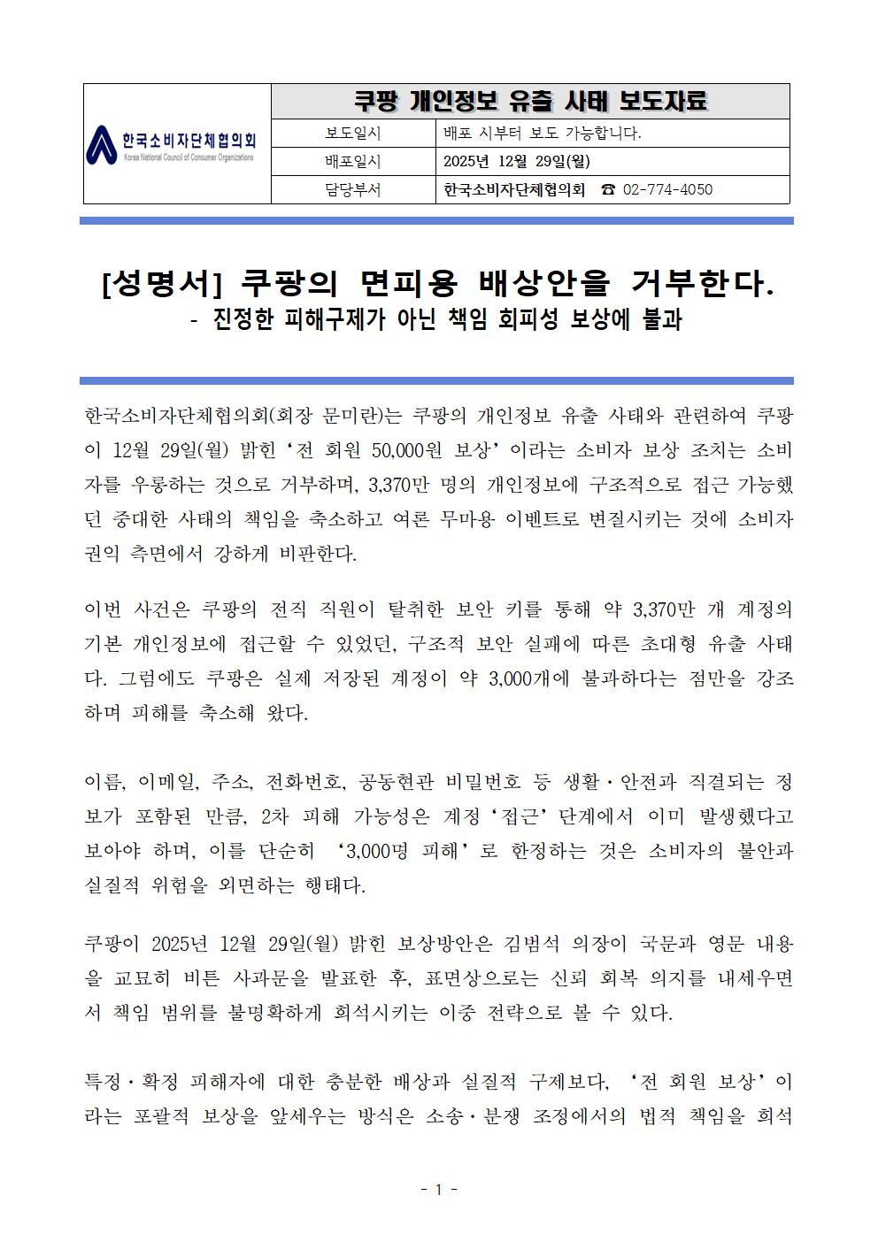 [이슈&운동] 쿠팡 소비자 보상방안에 대한 성명서