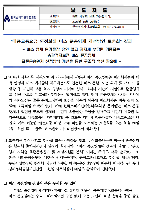 [물가감시] 대중교통요금 안정화와 버스 준공영제 개선방안 토론회 개최 결과 보도자료