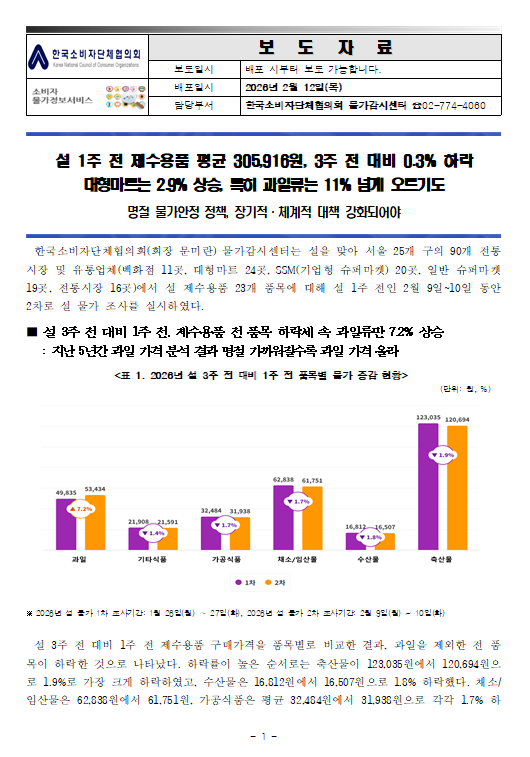 [물가감시] 2026년 설 특별물가 1차 가격조사 결과 보도자료